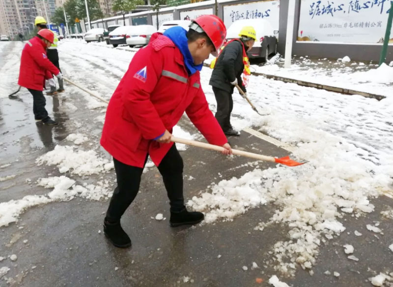 有想法就付諸于行動(dòng),簡(jiǎn)短交流后,員工們開(kāi)始有效的分工安排,開(kāi)裝載機(jī)、拿鐵鍬、用掃帚、撒工業(yè)鹽、保障物資等,默契合作。