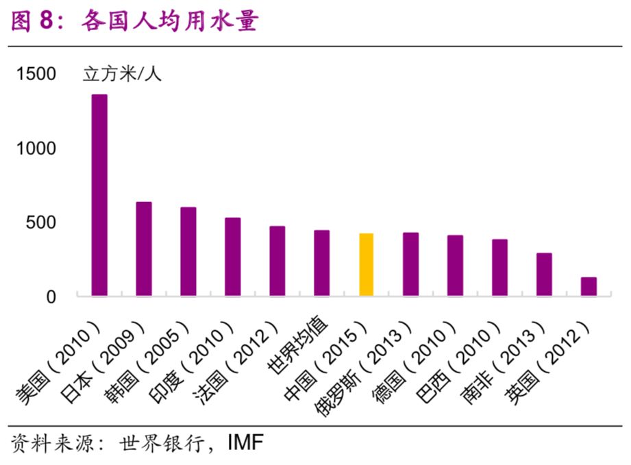 在用電與用水方面,中國的人均水平仍然較低,與人均GDP水平相適應。中國人均用電量和人均用水量分別為3927千瓦時/人(2014年數據)、425立方米/人(2015年數據),與世界平均水平(3966千瓦時/人、442立方米/人)大致相近,也與中國的人均GDP水平相適應,是美國(12984千瓦時/人、1357立方米/人)的30.2%、31.4%(圖7、8)。