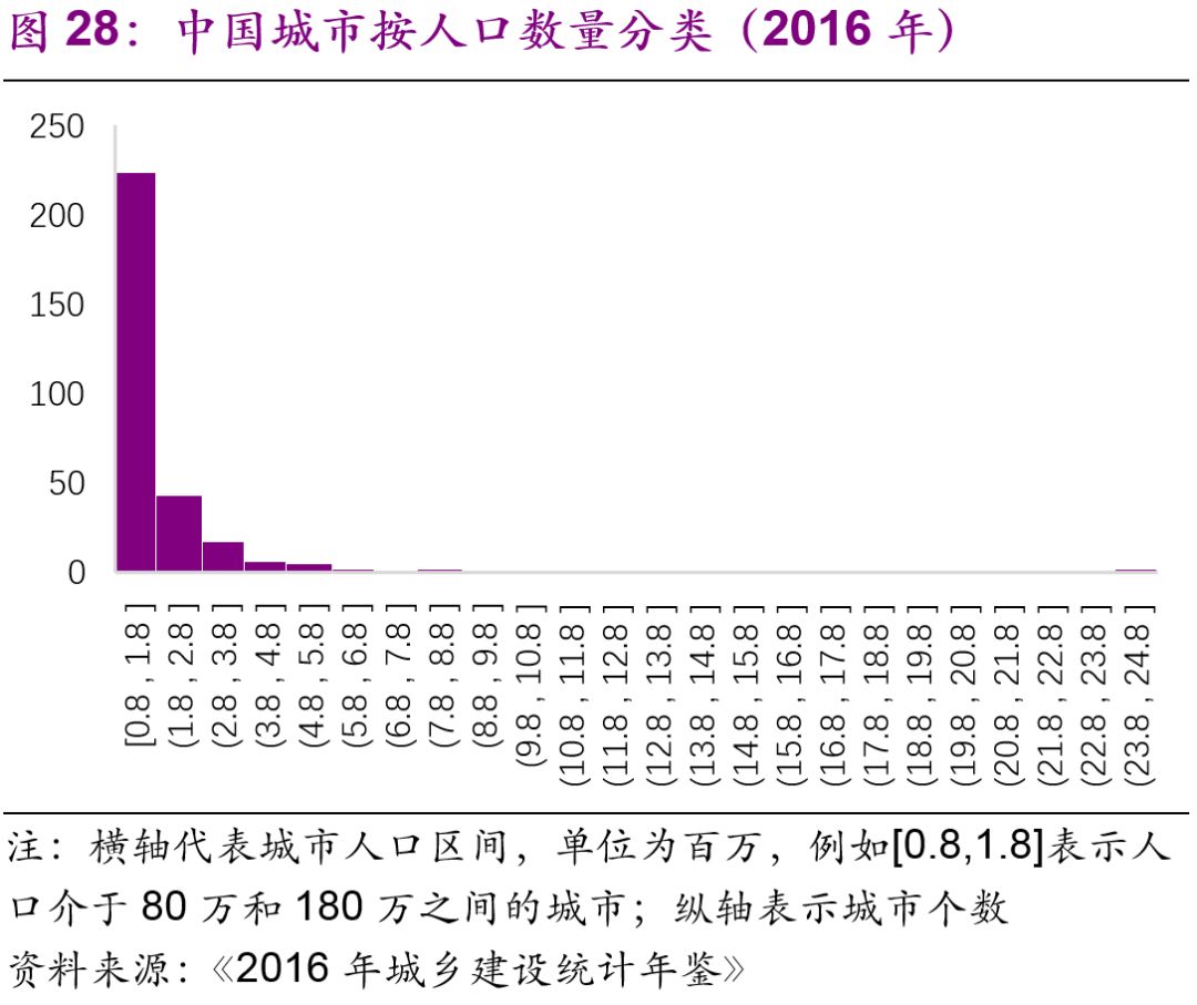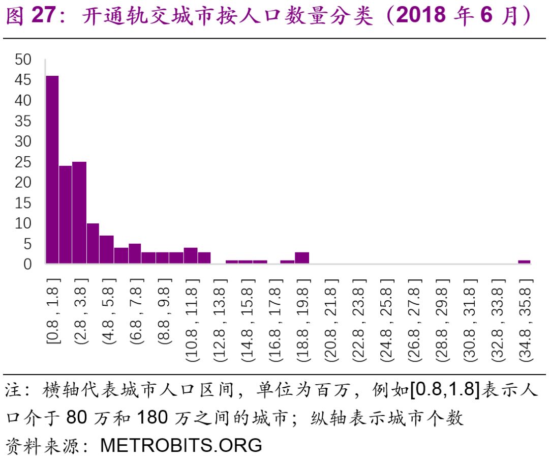 擬建地鐵、輕軌線路初期客運強度分別不低于每日每公里0.7萬人次、0.4萬人次,遠期客流規(guī)模分別達到單向高峰小時3萬人次以上、1萬人次以上。但是同時也強調了:“以上申報條件將根據經濟社會發(fā)展情況按程序適時調整?!?016年,中國城市中市區(qū)常住人口在150萬以上的城市共有111個,對比目前已經開通軌道交通的城市數量(34個),仍有一定的發(fā)展空間。而從國際上看,建設軌道交通的城市人口的起點[19]大約為100萬(圖27),如果長期內中國將建設軌道交通的人口標準下調至100萬,那么將有225個城市符合標準(圖28)。