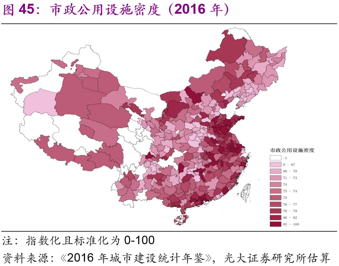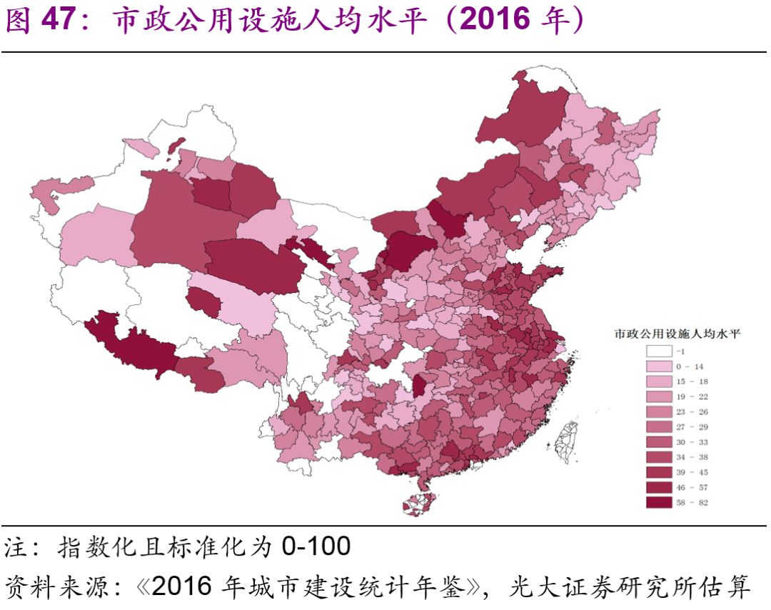 東部和部分西部城市的市政公用設施水平較高。為了綜合分析各個城市的市政公用設施水平,我們使用主成份分析法,選取人均日生活用水量、人均道路面積、人均公園綠地面積,對2016年中國各城市得出了綜合的城市市政公用設施的總量[27]、密度(圖45-46)和人均水平(圖47-48)進行了比較。無論從總量、密度還是人均水平上來看,東部和部分西部城市都比較高,反而是一些中部和東北部城市的城市市政公用設施水平處于全國比較落后的狀態(tài)。