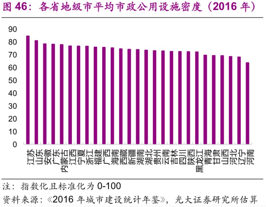 城市市政公用設施投資結構不斷變化。隨著中國城鎮(zhèn)化的不斷推進,2016年投資額達1.7萬億元的城市市政公用設施投資結構有了較大變化:1990年占據較大比重的燃氣(16%)、供水(20%)隨著滲透率觸及“天花板[26]”后比重下降較快,兩者2016年的比重分別為2%、3%;而更能體現城市功能升級的公共交通、道路橋梁等的比重上升較快,1990年兩者的比重分別為8%、26%,2016年則分別為23%、43%;此外,許多新型的城市市政公用設施投資開始出現,例如地下綜合管廊,2016年占比達到了1.7%(圖44)。