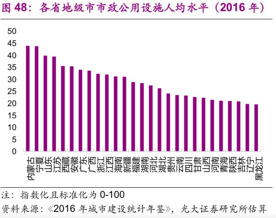 歷史上城市市政公用設施投資增速與總體基礎設施建設投資增速相關性較高,但近年來分化加大。而2014年開始實行的規(guī)范地方政府債務的一系列舉措使得當年的城市市政公用設施投資增速轉負,2014、2015年的增速分別為-0.63%、-0.25%,直到2016年才轉正。而城市市政公用設施投資占總體基礎設施建設投資的比例則不斷下降,2016年僅為11.5%,較2003年的高點(32.6%)下降了21個百分點(圖43)。